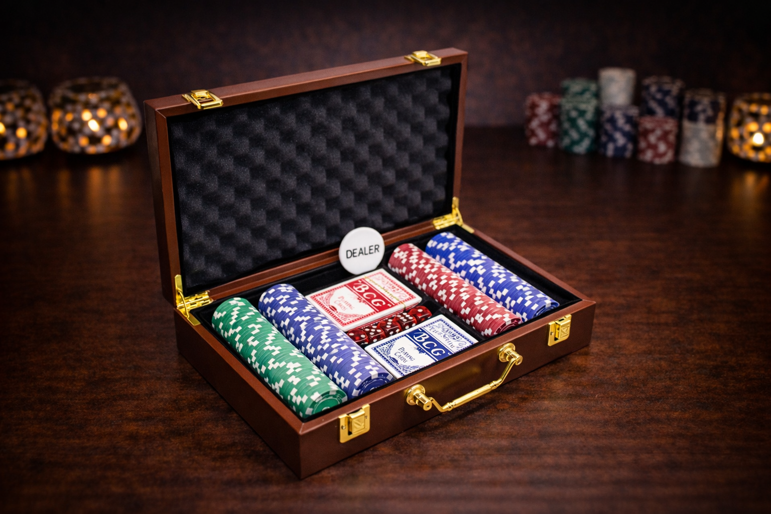 Elevate your poker nights to a professional level. The 300-chip Premium Poker Set offers a true casino atmosphere at home, complete with a stylish and functional leather-covered carrying case . The soft protective lining inside keeps all pieces organized and secure.