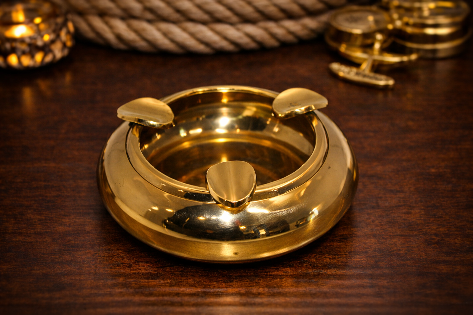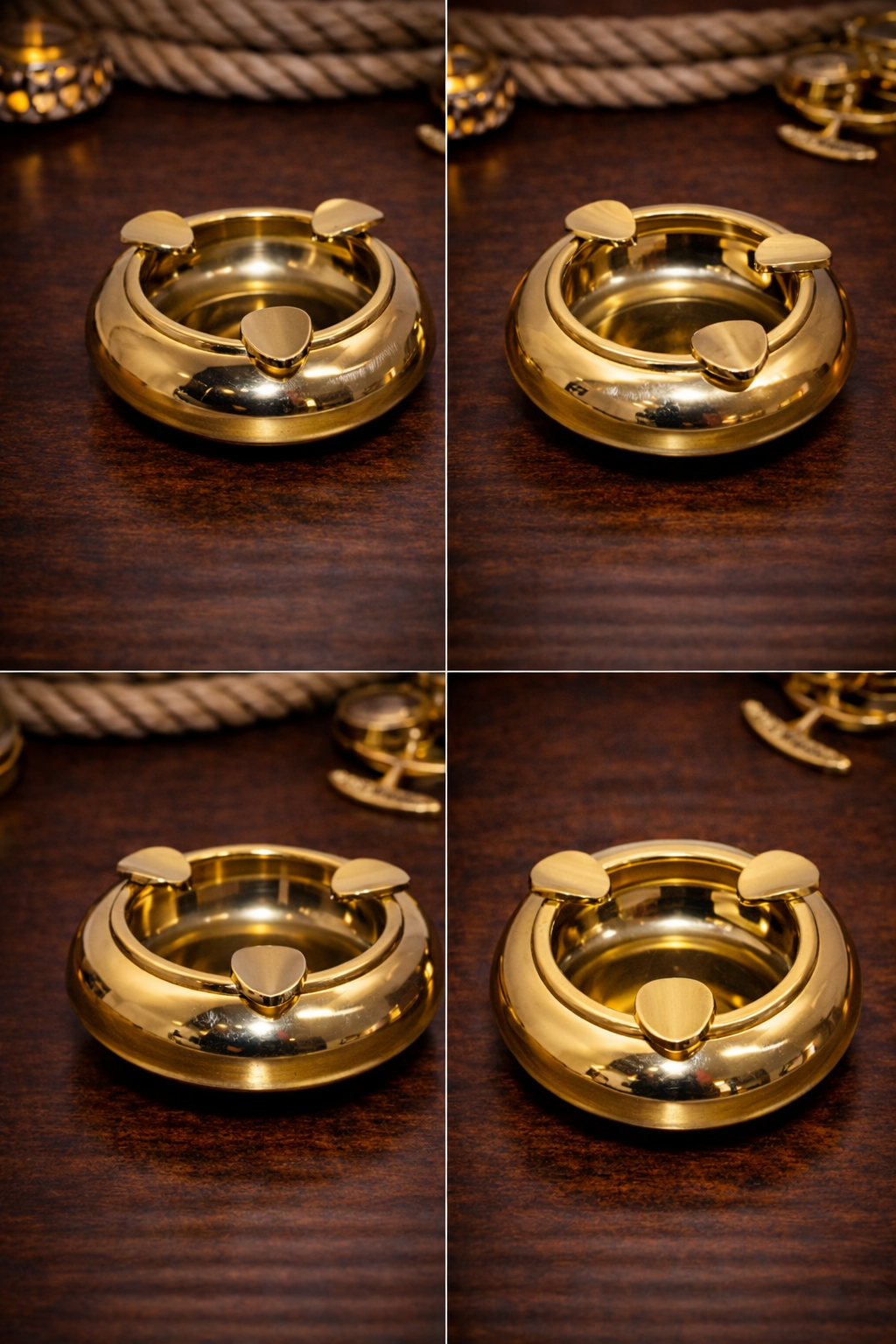 Parlak altın renkli metal gövdesi ve yuvarlak formu ile öne çıkan bu metal küllük, klasik ve zamansız bir şıklık sunar. 3 adet sigara koyma yuabası, aynı anda birden fazla kullanım için pratiklik sağlar ve masada düzen oluşturur.