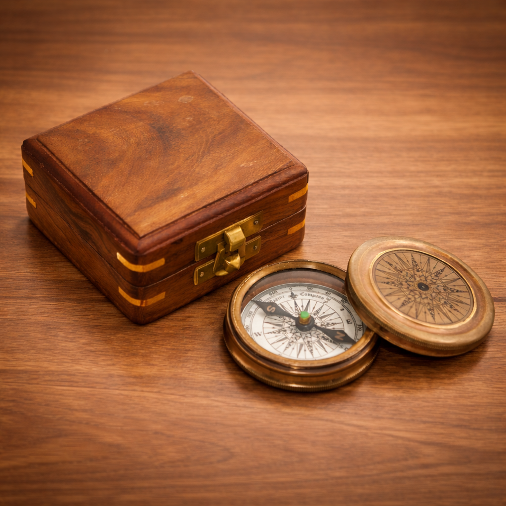 Vintage Pusula & Ahşap Kutu Seti – Klasik Denizci Tarzı Koleksiyon Ürünü